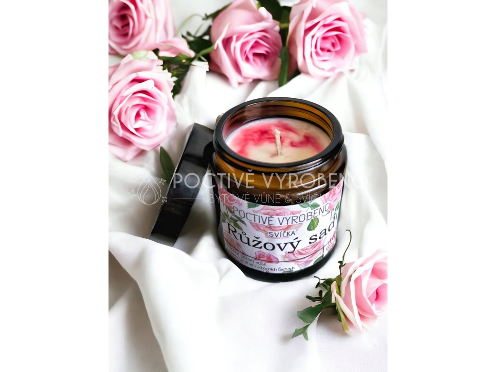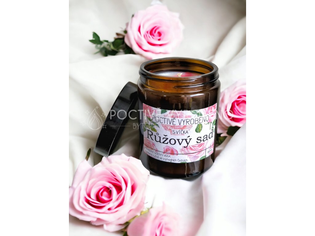 Růžový sad voní jako čerstvě natrhaná kytice růží v plném květu s nuancemi pelargónie a fialky, vše zabalené v jemném dřevitém základu.