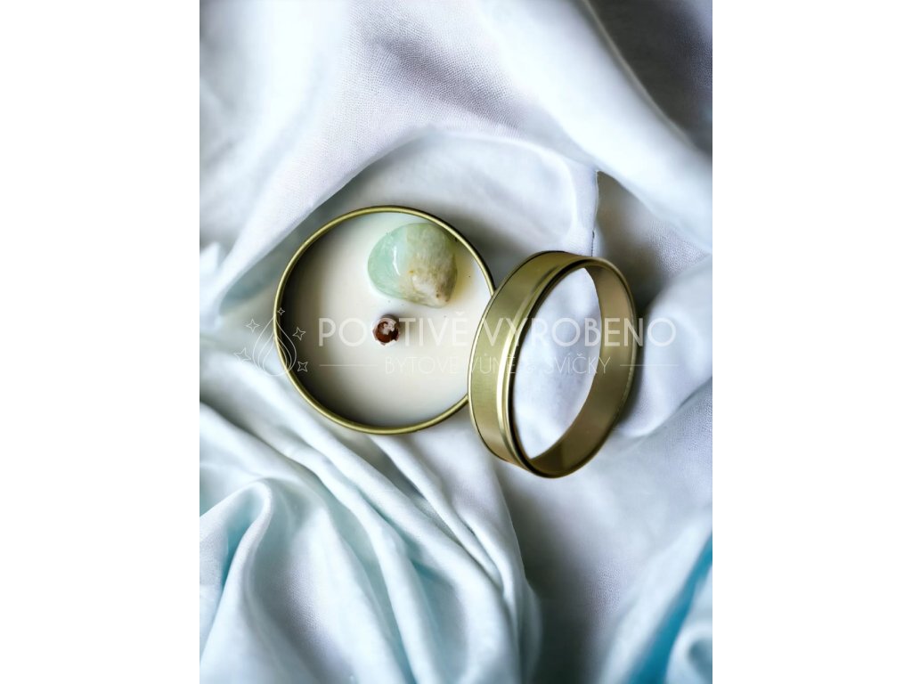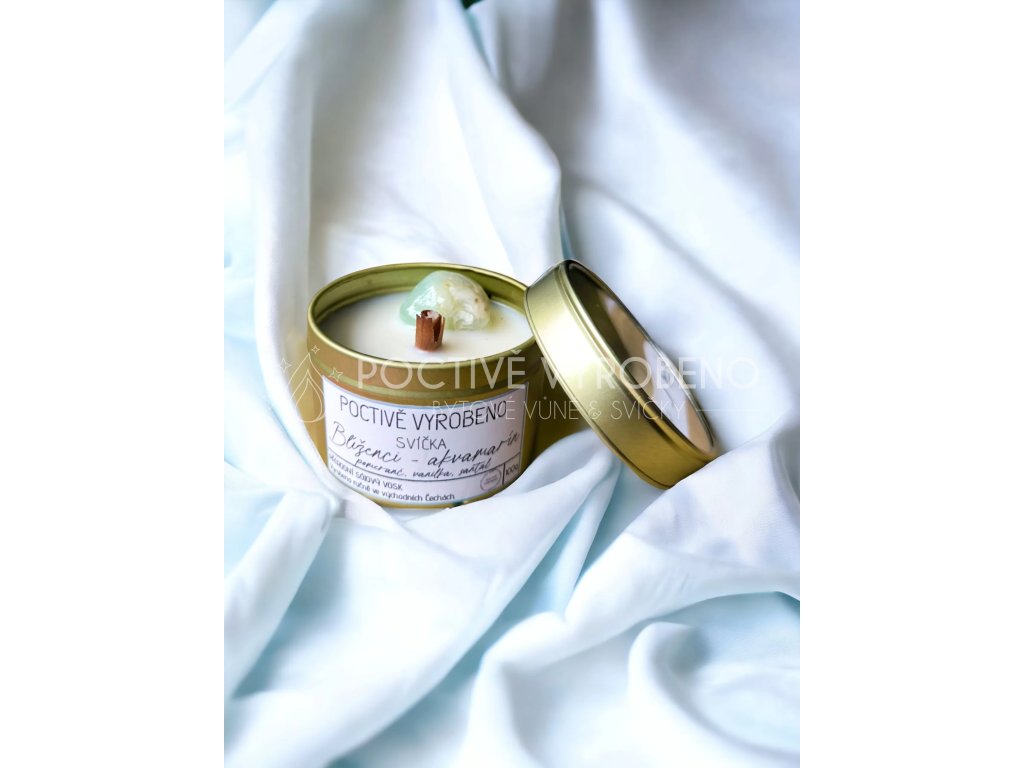Kolekce svíček dle znamení zvěrokruhu s krystaly podporující charakteristiku vnitřního nastavení daného znamení. \nVoní po vanilce, pomeranči a santalovém dřevu. \nBlíženci vnímavé a přizpůsobivé povahy a intelektuálního založení. \nAkvamarín pomáhá vědomému vyjádření a pravdivým slovům, zároveň uklidňuje a ladí do příjemného rozpoložení. \n \nKamínky byly očištěny pod tekoucí vodou a nabity při úplňku na měsíčním světle 7. ledna 2023. \n100g organického sójového vosku \ns bavlněným a dřevěným knotem \nintenzita vůně: silná \ndoba hoření: 30h (doba hoření je orientační, záleží na vaší péči o svíčku) \nKaždý kamínek je jedinečný a proto tvar a velikost se může lišit. \n \ndoporučení a bezpečnostní pokyny \njedná se o dekoraci, svíčka není určena ke konzumaci \nnikdy nenechávejte rozehřát veškerý obsah vosku \nhořící svíčku nikdy nenechávejte bez dozoru \nhořící svíčku umístěte mimo dosah dětí a domácích zvířat \nhořící svíčku nenechávejte na vznětlivých předmětech nebo v jejich blízkosti \nsvíčky neumisťujte do průvanu ani blízko zdroje tepla \nsprávná péče o knot má zásadní vliv na životnost a celkové hoření svíčkyBuďte první, kdo napíše příspěvek k této položce.