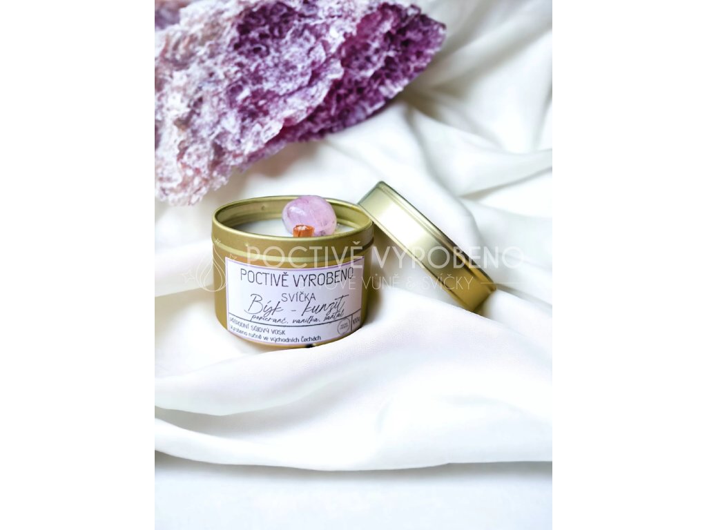Kolekce svíček dle znamení zvěrokruhu s krystaly podporující charakteristiku vnitřního nastavení daného znamení. \nVoní po vanilce, pomeranči a santalovém dřevu. \nBýk– vytrvalý, důsledný a někdy trochu těžkopádný. \nKunzit podporuje láskyplnou energii a duchovní sílu, odbourává vnitřní bloky. \n \nKamínky byly očištěny pod tekoucí vodou a nabity při úplňku na měsíčním světle 7. ledna 2023. \n100g organického sójového vosku \ns bavlněným a dřevěným knotem \nintenzita vůně: silná \ndoba hoření: 30h (doba hoření je orientační, záleží na vaší péči o svíčku) \nKaždý kamínek je jedinečný a proto tvar a velikost se může lišit. \n \ndoporučení a bezpečnostní pokyny \njedná se o dekoraci, svíčka není určena ke konzumaci \nnikdy nenechávejte rozehřát veškerý obsah vosku \nhořící svíčku nikdy nenechávejte bez dozoru \nhořící svíčku umístěte mimo dosah dětí a domácích zvířat \nhořící svíčku nenechávejte na vznětlivých předmětech nebo v jejich blízkosti \nsvíčky neumisťujte do průvanu ani blízko zdroje tepla \nsprávná péče o knot má zásadní vliv na životnost a celkové hoření svíčkyBuďte první, kdo napíše příspěvek k této položce.