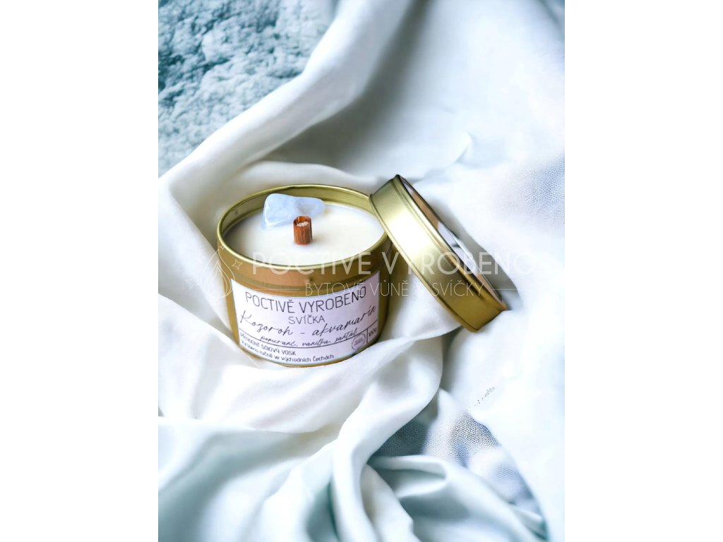 Kolekce svíček dle znamení zvěrokruhu s krystaly podporující charakteristiku vnitřního nastavení daného znamení. \nVoní po vanilce, pomeranči a santalovém dřevu. \nKozoroh– ambiciózní a cílevědomý. \nAkvamarín je kamenem mystiků, vizionářů a léčitelů, vnáší do naší mysli čistotu a jas. \n \nKamínky byly očištěny pod tekoucí vodou a nabity při úplňku na měsíčním světle 7. ledna 2023. \n100g organického sójového vosku \ns bavlněným a dřevěným knotem \nintenzita vůně: silná \ndoba hoření: 30h (doba hoření je orientační, záleží na vaší péči o svíčku) \nKaždý kamínek je jedinečný a proto tvar a velikost se může lišit. \n \ndoporučení a bezpečnostní pokyny \njedná se o dekoraci, svíčka není určena ke konzumaci \nnikdy nenechávejte rozehřát veškerý obsah vosku \nhořící svíčku nikdy nenechávejte bez dozoru \nhořící svíčku umístěte mimo dosah dětí a domácích zvířat \nhořící svíčku nenechávejte na vznětlivých předmětech nebo v jejich blízkosti \nsvíčky neumisťujte do průvanu ani blízko zdroje tepla \nsprávná péče o knot má zásadní vliv na životnost a celkové hoření svíčky \n \nBuďte první, kdo napíše příspěvek k této položce.