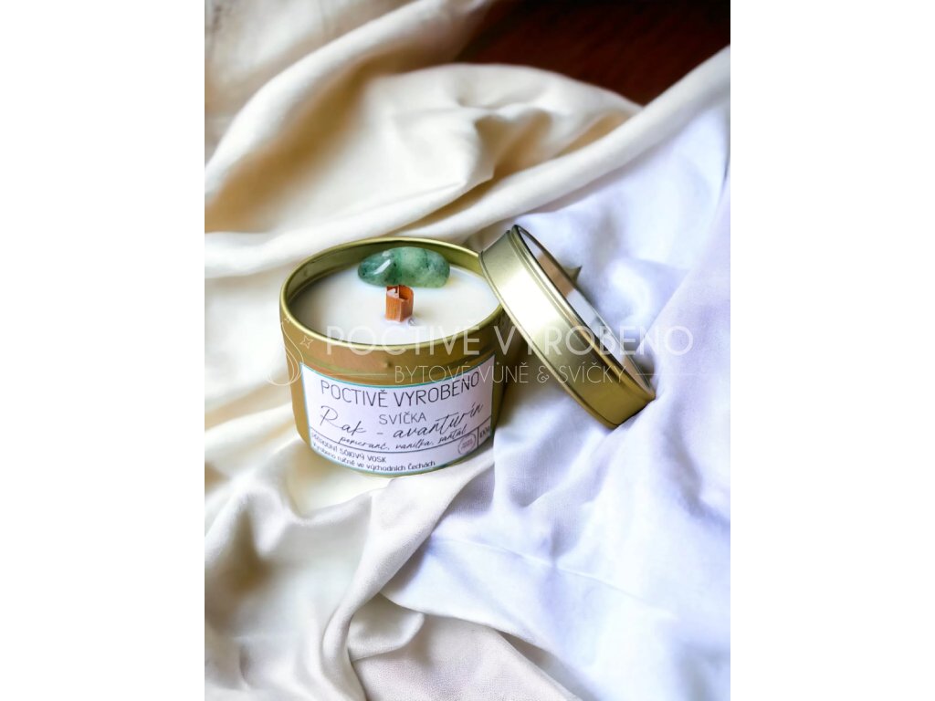 Kolekce svíček dle znamení zvěrokruhu s krystaly podporující charakteristiku vnitřního nastavení daného znamení. \nVoní po vanilce, pomeranči a santalovém dřevu. \nRak– citově založená bytost milující domov a rodinu. \nAvanturín má uklidňující sílu, pomáhá navázat vztah s přírodou a rozloží všechny negativní myšlenky. \n \nKamínky byly očištěny pod tekoucí vodou a nabity při úplňku na měsíčním světle 7. ledna 2023. \n100g organického sójového vosku \ns bavlněným a dřevěným knotem \nintenzita vůně: silná \ndoba hoření: 30h (doba hoření je orientační, záleží na vaší péči o svíčku) \nKaždý kamínek je jedinečný a proto tvar a velikost se může lišit. \n \ndoporučení a bezpečnostní pokyny \njedná se o dekoraci, svíčka není určena ke konzumaci \nnikdy nenechávejte rozehřát veškerý obsah vosku \nhořící svíčku nikdy nenechávejte bez dozoru \nhořící svíčku umístěte mimo dosah dětí a domácích zvířat \nhořící svíčku nenechávejte na vznětlivých předmětech nebo v jejich blízkosti \nsvíčky neumisťujte do průvanu ani blízko zdroje tepla \nsprávná péče o knot má zásadní vliv na životnost a celkové hoření svíčkyBuďte první, kdo napíše příspěvek k této položce.