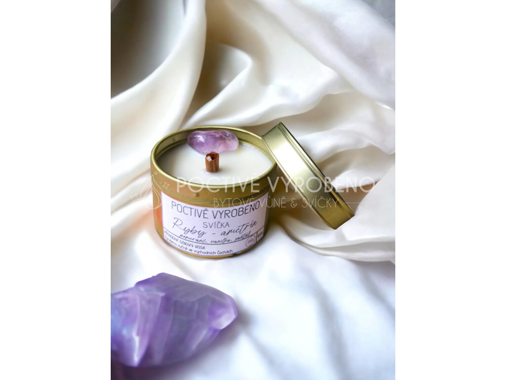 Kolekce svíček dle znamení zvěrokruhu s krystaly podporující charakteristiku vnitřního nastavení daného znamení. \nVoní po vanilce, pomeranči a santalovém dřevu. \nRyby jsou jemné a klidné povahy duchovního založení. \nAmetrín v sobě nese duchovní čistotu, vnitřní klid a tiší strach, nervozitu a stres. \n \nKamínky byly očištěny pod tekoucí vodou a nabity při úplňku na měsíčním světle 7. ledna 2023. \n100g organického sójového vosku \ns bavlněným a dřevěným knotem \nintenzita vůně: silná \ndoba hoření: 30h (doba hoření je orientační, záleží na vaší péči o svíčku) \nKaždý kamínek je jedinečný a proto tvar a velikost se může lišit. \n \ndoporučení a bezpečnostní pokyny \njedná se o dekoraci, svíčka není určena ke konzumaci \nnikdy nenechávejte rozehřát veškerý obsah vosku \nhořící svíčku nikdy nenechávejte bez dozoru \nhořící svíčku umístěte mimo dosah dětí a domácích zvířat \nhořící svíčku nenechávejte na vznětlivých předmětech nebo v jejich blízkosti \nsvíčky neumisťujte do průvanu ani blízko zdroje tepla \nsprávná péče o knot má zásadní vliv na životnost a celkové hoření svíčkyBuďte první, kdo napíše příspěvek k této položce.