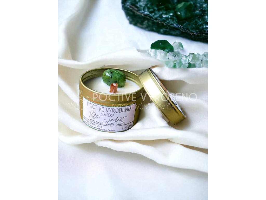 Kolekce svíček dle znamení zvěrokruhu s krystaly podporující charakteristiku vnitřního nastavení daného znamení. \nVoní po vanilce, pomeranči a santalovém dřevu. \nŠtír je velice obětavý a laskavý ke svým přátelům, ale pokud se mu někdo znelíbí dá mu to jasně najevo. \nJadeit posiluje pozitivní myšlení, pochopení druhých, láskyplné emoce a ohleduplnost. \n \nKamínky byly očištěny pod tekoucí vodou a nabity při úplňku na měsíčním světle 7. ledna 2023. \n100g organického sójového vosku \ns bavlněným a dřevěným knotem \nintenzita vůně: silná \ndoba hoření: 30h (doba hoření je orientační, záleží na vaší péči o svíčku) \nKaždý kamínek je jedinečný a proto tvar a velikost se může lišit. \n \ndoporučení a bezpečnostní pokyny \njedná se o dekoraci, svíčka není určena ke konzumaci \nnikdy nenechávejte rozehřát veškerý obsah vosku \nhořící svíčku nikdy nenechávejte bez dozoru \nhořící svíčku umístěte mimo dosah dětí a domácích zvířat \nhořící svíčku nenechávejte na vznětlivých předmětech nebo v jejich blízkosti \nsvíčky neumisťujte do průvanu ani blízko zdroje tepla \nsprávná péče o knot má zásadní vliv na životnost a celkové hoření svíčkyBuďte první, kdo napíše příspěvek k této položce.